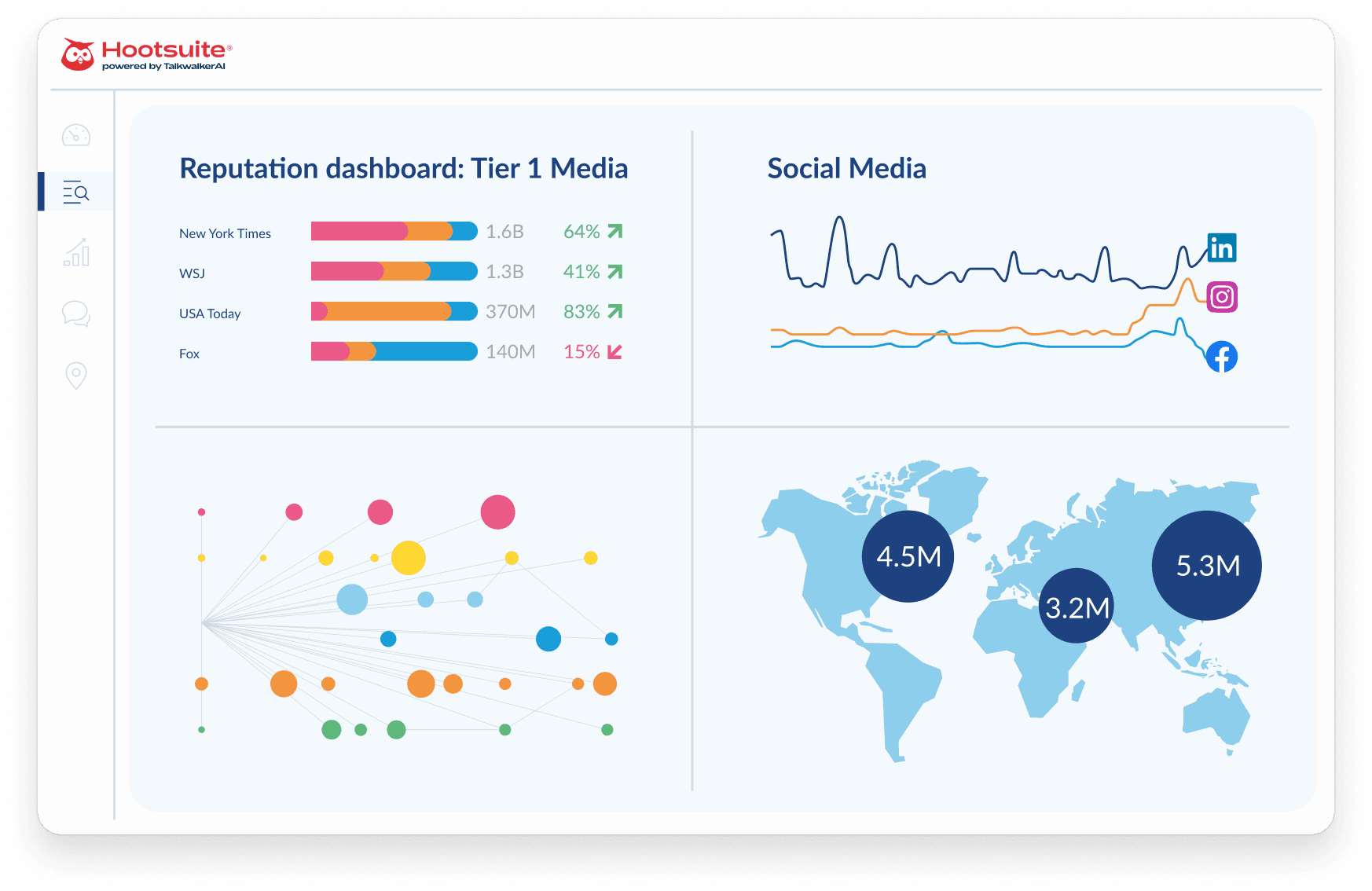 Corporate reputation management is the practice of monitoring and influencing how the public, customers, investors, and employees perceive your brand. Hootsuite powered by Talkwalker AI helps by providing real-time media monitoring, sentiment analysis, and issue detection across all channels — so you can protect your corporate image and respond quickly to emerging risks.